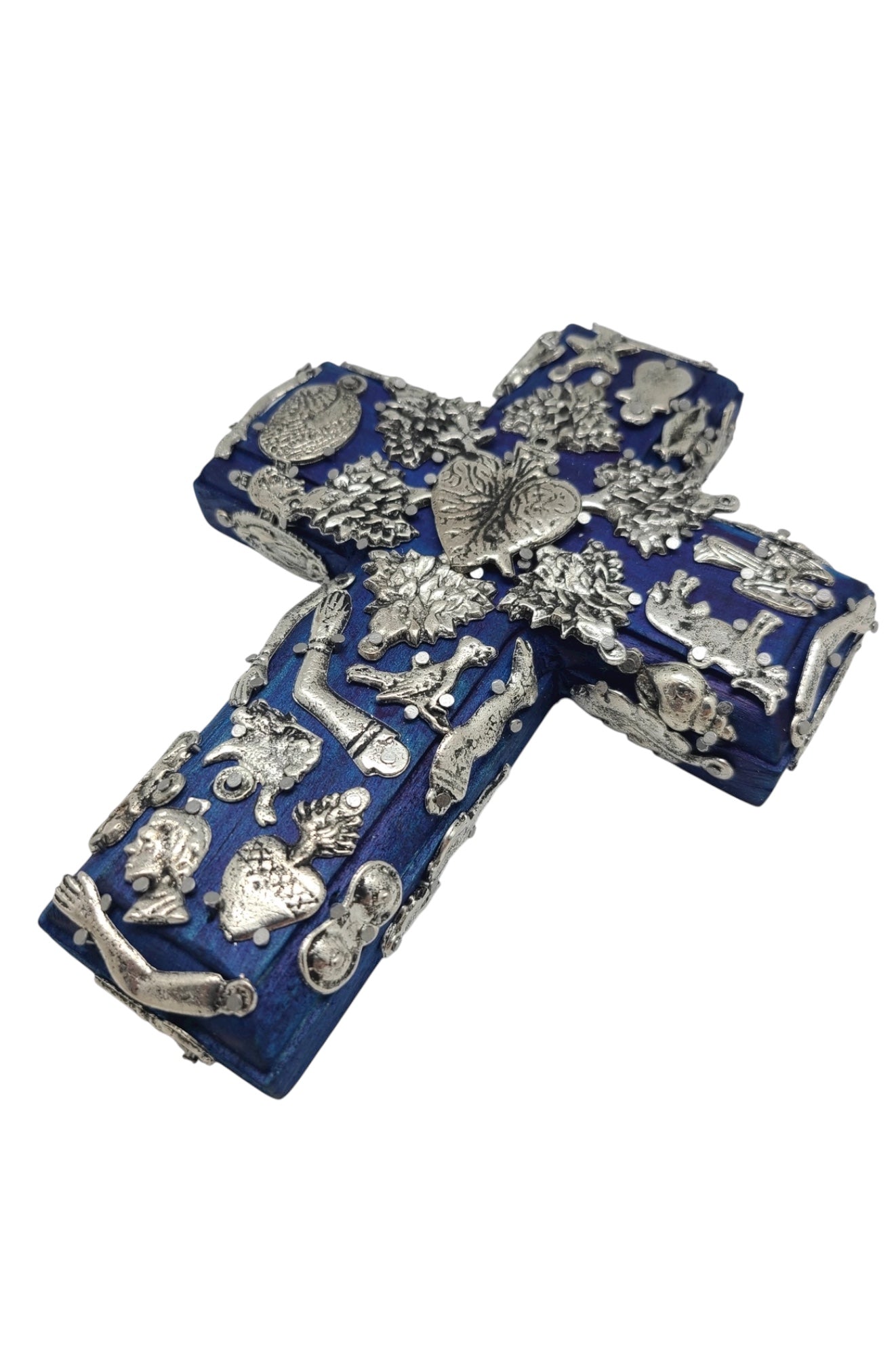 Infuse your home with spiritual charm and cultural artistry with the Wood Milagros Cross from Contreras Designs. Handcrafted with care, this beautiful wall cross features a vibrant blue wooden base adorned with traditional silver-toned milagros—tiny devotional charms symbolizing prayers, hopes, and gratitude. Measuring 5” x 6.5”, it’s the perfect size to accent any wall, whether in a living room, entryway, or personal sanctuary.